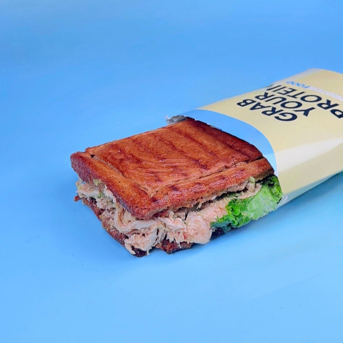 Atún mezclado con nuestra cremosa lactonesa, salsa pesto casera, palta fresca y tomate, servido en pan de avena proteico tostado y crocante.