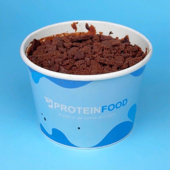 Helado proteico sabor chocolate, brownie proteico de cacao y harina de avena, chantilly de coco y pecanas caramelizadas con eritritol.