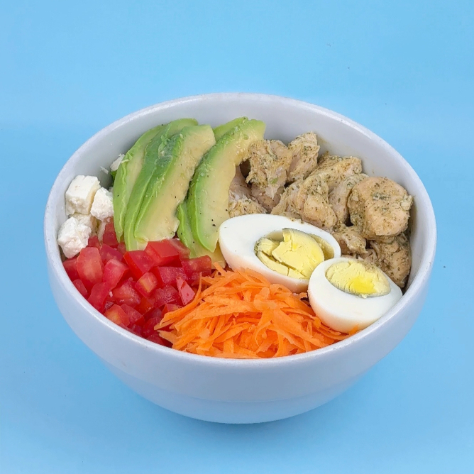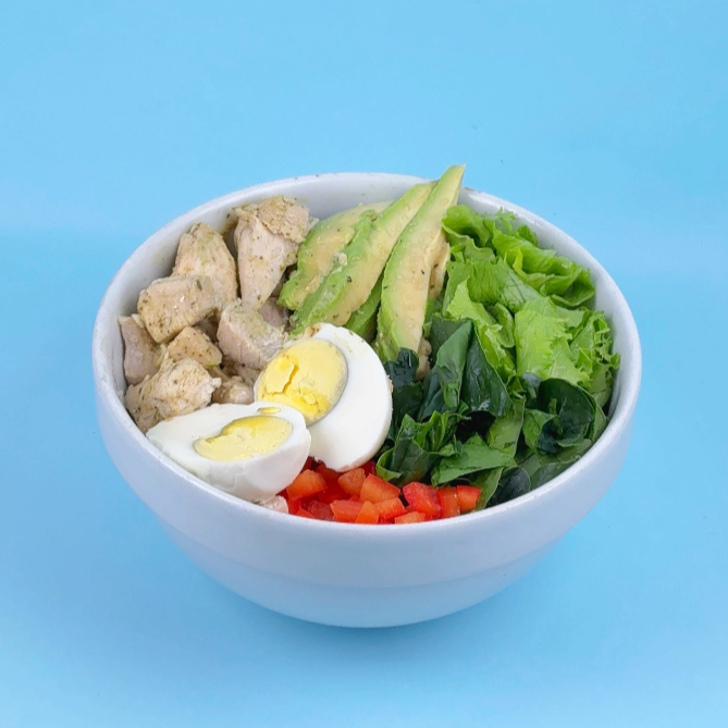 120gr de pollo en cubos, espinaca, lechuga, palta, huevo duro, arroz integral y pimiento. Salsa de yogurt.