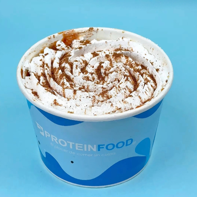 Delicioso frappe con crema proteica, sabor dulce de leche y hielo.