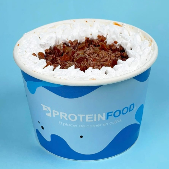Exquisito postre hecho a base de avena, proteína, crema proteica de cacao, leche light, proteína whey, claras de huevo, panela, stevia y acompañado de nuestro delicioso fudge de proteína.