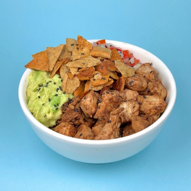 Arroz integral, 120 gr pollo en cubos, guacamole, pico de gallo y 4 uds de pitachips integrales.