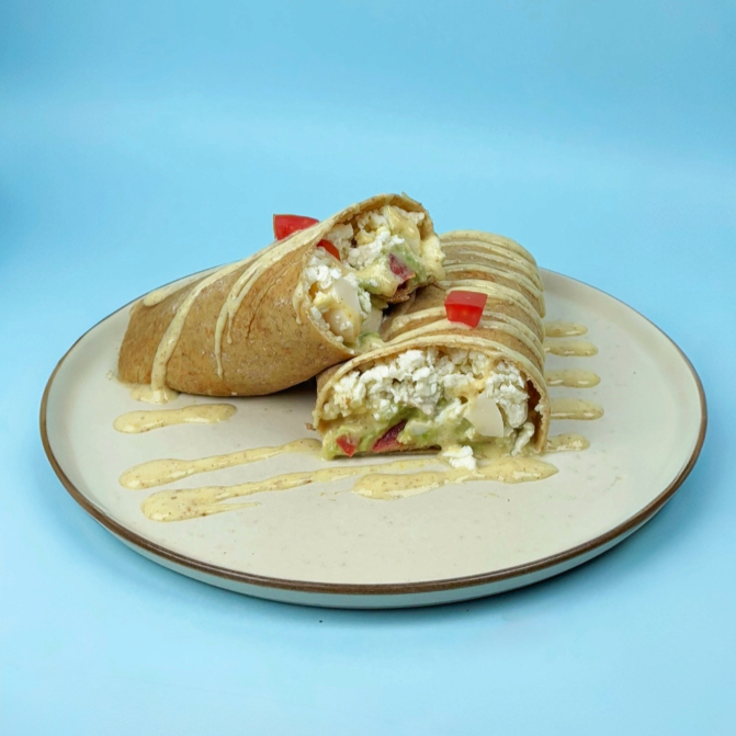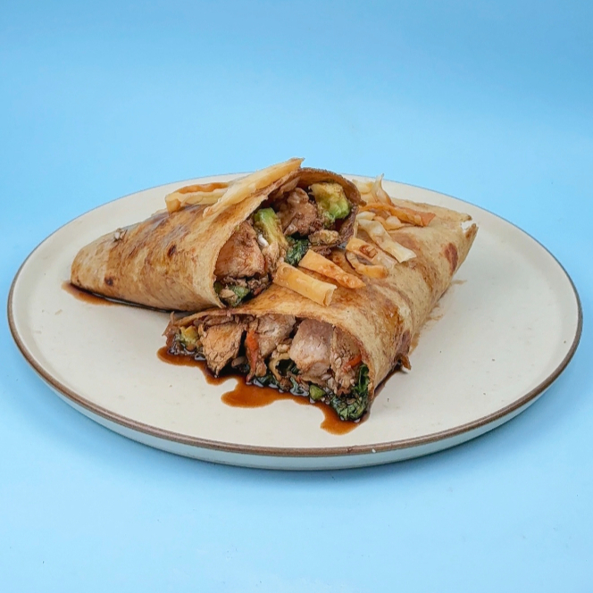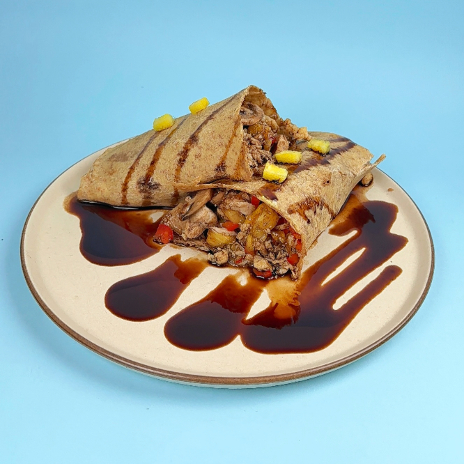 120gr de pollo en cubos, salsa de tomate, queso fresco light, pimiento y champiñones, envuelto en un delicioso y contundente wrap.