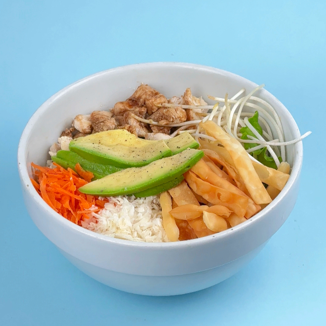 Una exquisita mezcla oriental de arroz integral, zanahoria, palta, wantán en tiras, col lombarda y 120 gr de pollo en cubos. Acompañada de nuestra salsa oriental z.