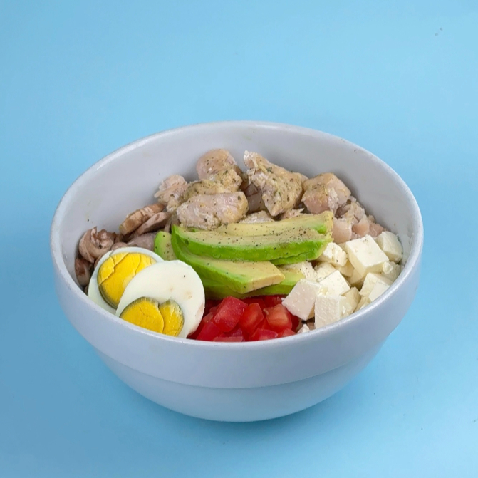 Pasta integral, 120gr de pollo en cubos, palta, tomate, queso fresco, champiñones, huevo duro y salsa de yogurt.