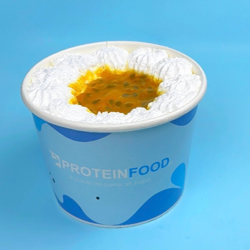 Base de galleta de harina de arroz, mousse de maracuya (proteína aislada, leche, stevia) decorado con chantilly de coco y maracuyá.