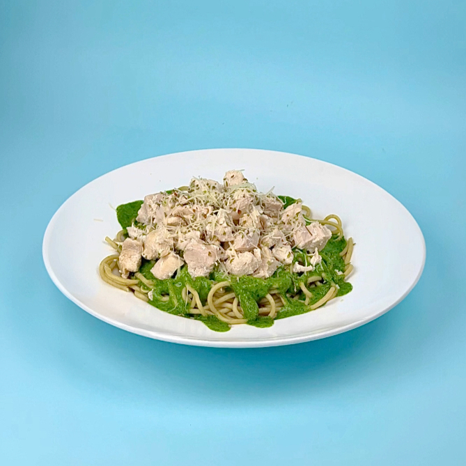 120gr de pollo en cubos, pasta integral, salsa pesto fit y queso parmesano light.