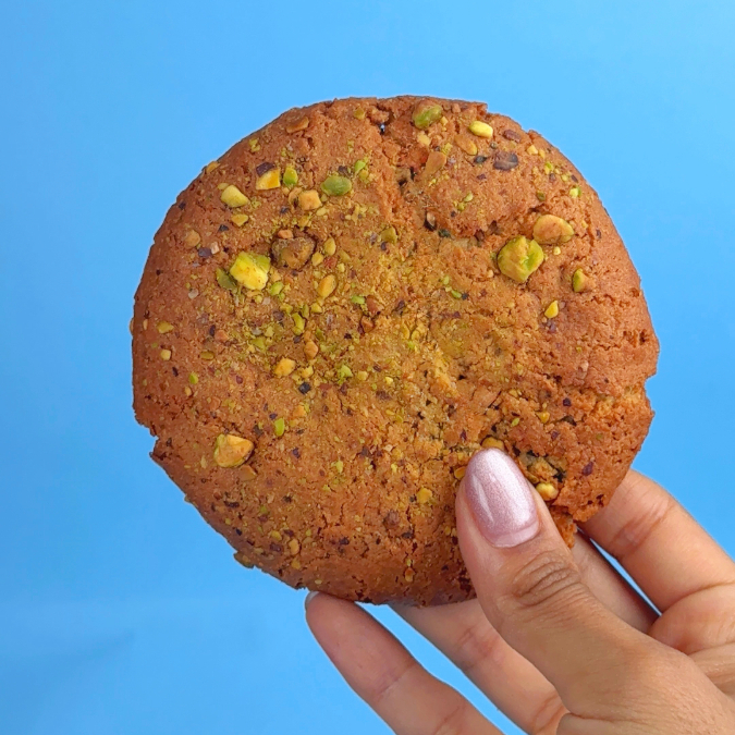 Galleta elaborada con harina de almendra, proteína de suero de leche, ghee, pistacho, huevo y eritritol