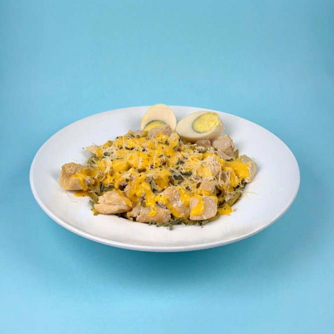 120gr de pollo en cubos, pasta integral, huevo duro, salsa huancaína y queso parmesano light.