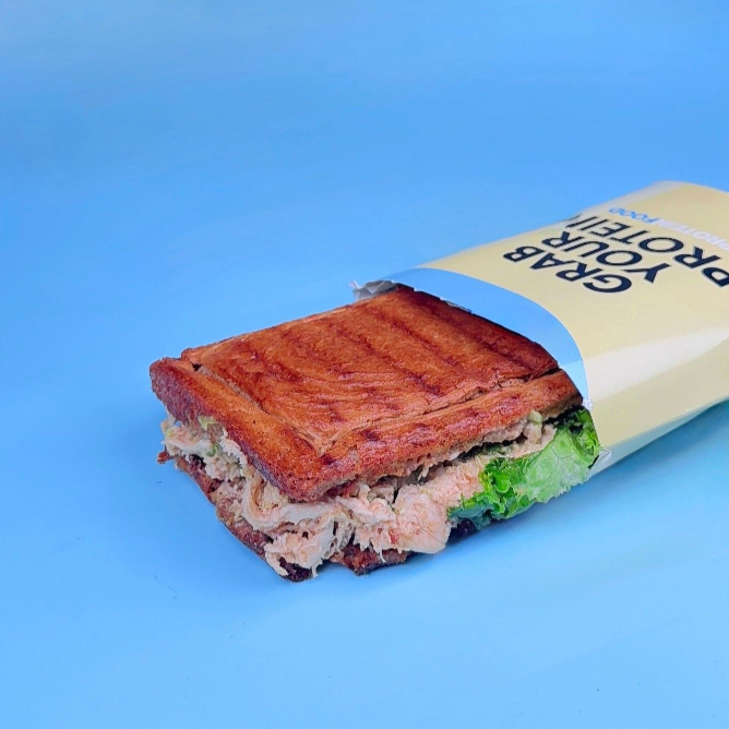 Atún mezclado con nuestra cremosa lactonesa, salsa pesto casera, palta fresca y tomate, servido en pan de avena proteico tostado y crocante.