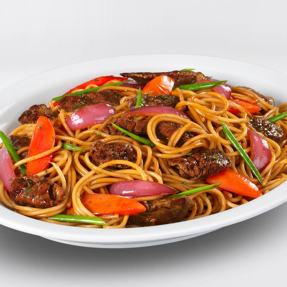 Tallarín saltado con carne y verduras. Incluye gaseosa personal de cortesía.