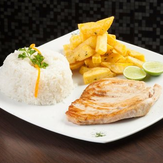 Pechuga de pollo a la plancha con papas fritas y arroz. Incluye gaseosa personal de cortesía.