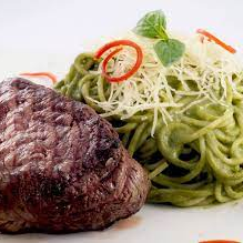 Spaghetti al pesto acompañado de lomo. Incluye gaseosa personal de cortesía.