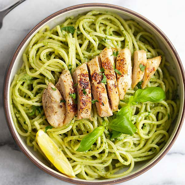 Spaghetti al Pesto con Pechuga de Pollo + Gaseosa