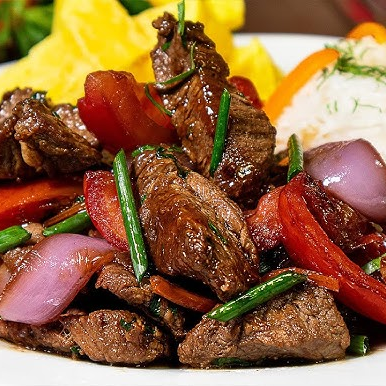 Lomo saltado con verduras, papas fritas y arroz. Incluye gaseosa personal de cortesía.