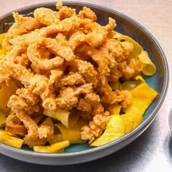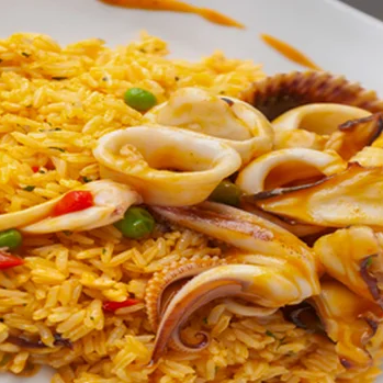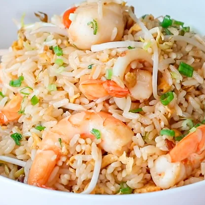 Arroz chaufa de calamar, langostinos, conchas, cebollas chinas y pedazos de tortilla.