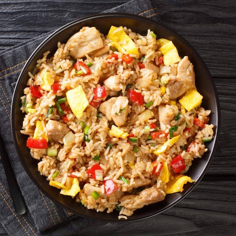 Arroz frito acompañado de verduras, huevo y pollo. Incluye gaseosa personal de cortesía.