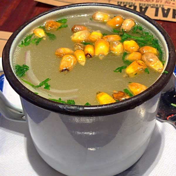 Copa de zumo de limón con pescado lenguado, choclo, cebolla y camote.
