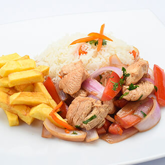 Pollo saltado con verduras, papas fritas y arroz. Incluye gaseosa personal de cortesía.