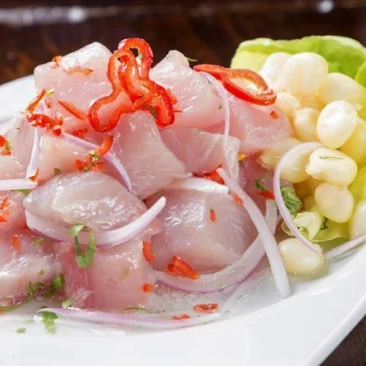 Ceviche de pescado lenguado con limón, cebolla, choclo y camote.