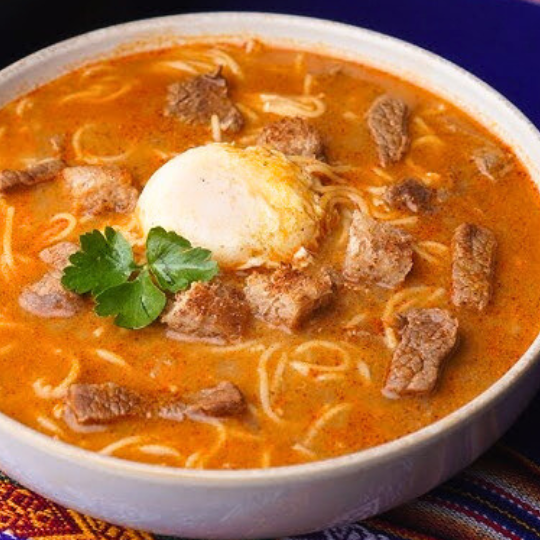 Sopa familiar a base de tomate, cabellos de ángel, carne y huevo.