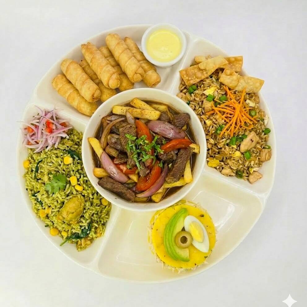 Ronda para compartir que consiste en : Lomo + Arroz Verde + 6 tequeños de queso o jamón + arroz chaufa de pollo + Causa de pollo