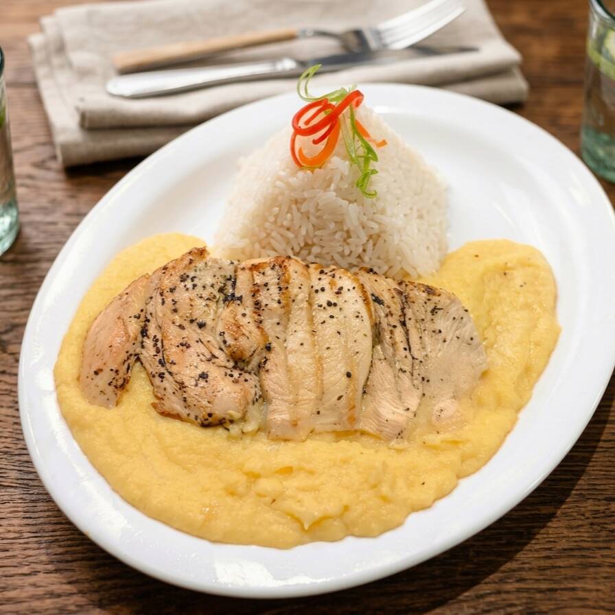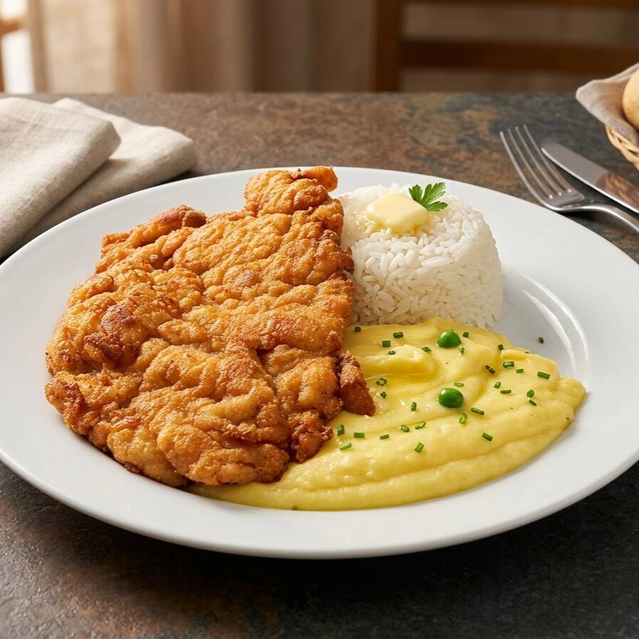 Puré de papa de la casa acompañado de arroz y milanesa de pollo.