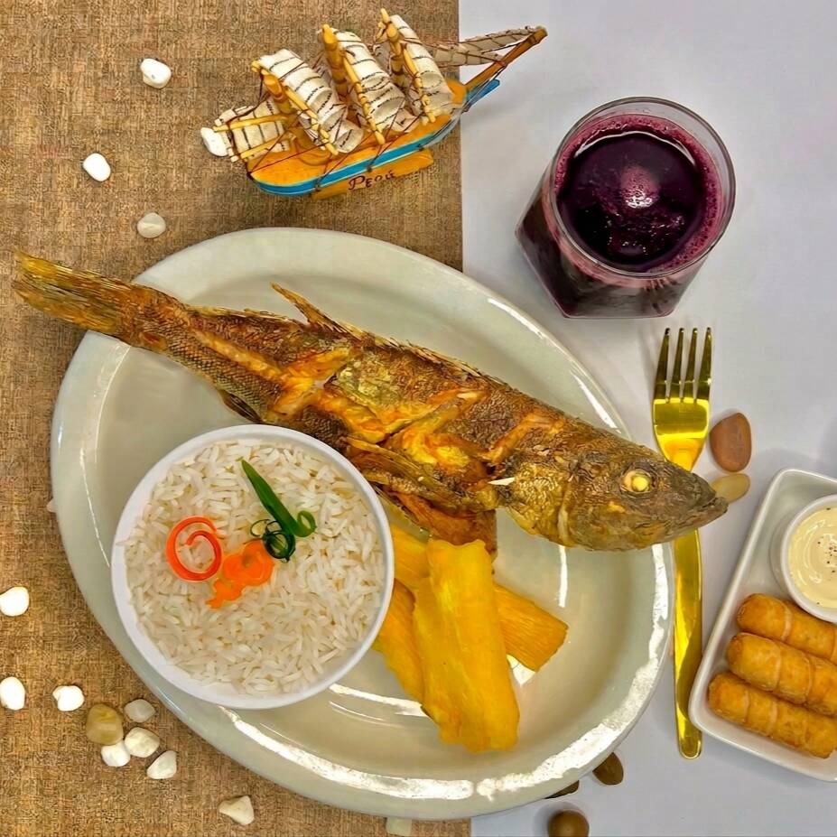 Ceviche de pescado, arroz con mariscos y chicharrón de pescado.