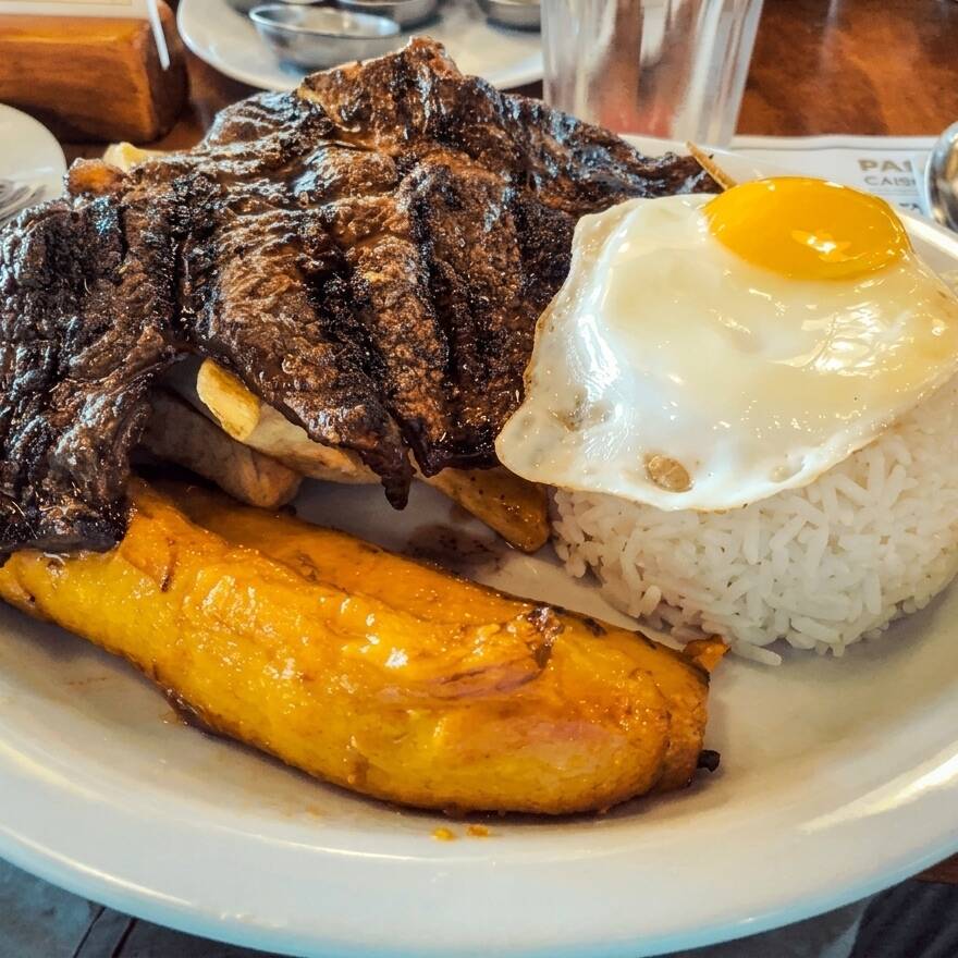 Plato hecho a base de arroz, frejoles y bistec. Acompañado de huevo frito y plátano frito.