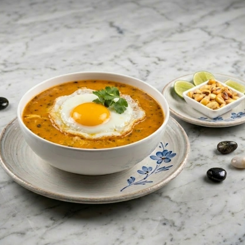 Sopa de la casa acompañado de huevo, tomate, cabellos de angel.