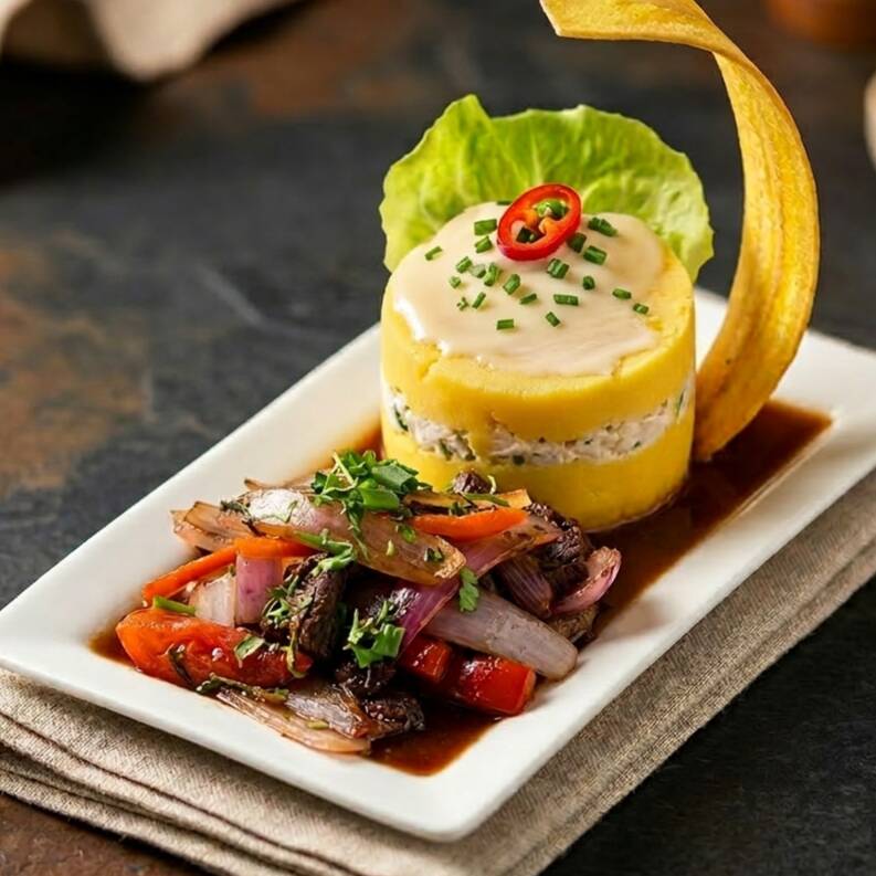 Causa rellena de pollo acompañado de trozos de lomo saltado.