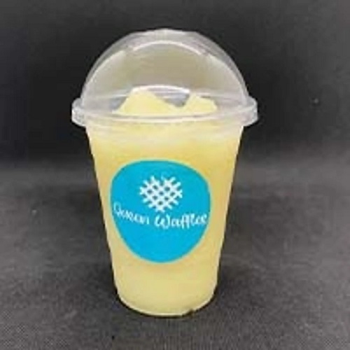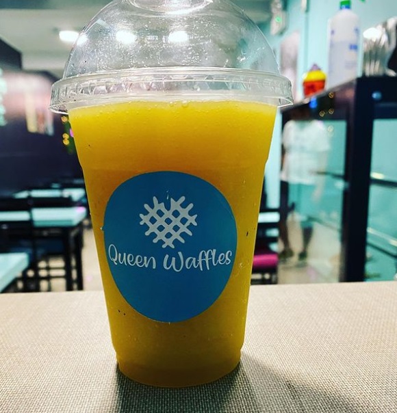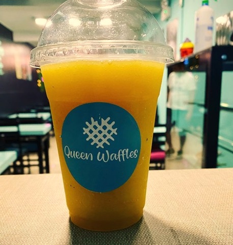 huevos revueltos con tocino, acompañado con 1/2 wafle con miel, un vaso de jugo y bebida caliente a elección