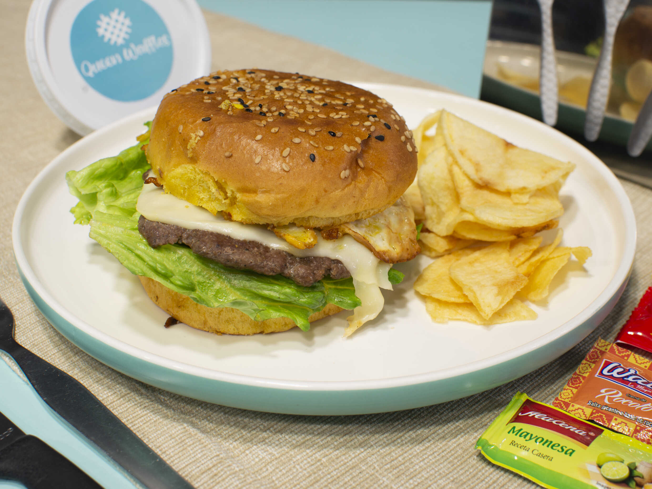 Pan brioche, hamburguesa de carne casera, queso edam, huevo, lecchuga tomate y papas en ojuelas