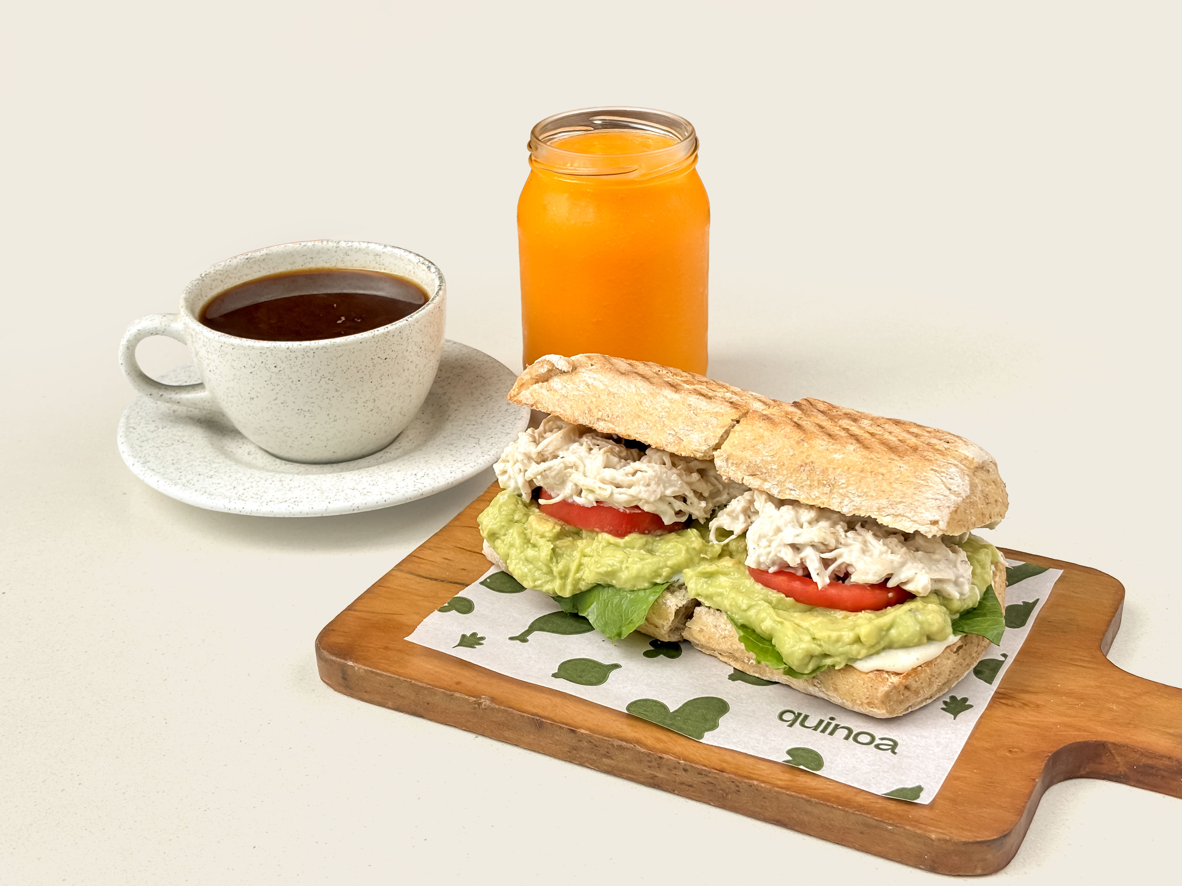 Pan ciabatta integral, pollo deshilachado, guacamole, tomate, mayonesa y sal.