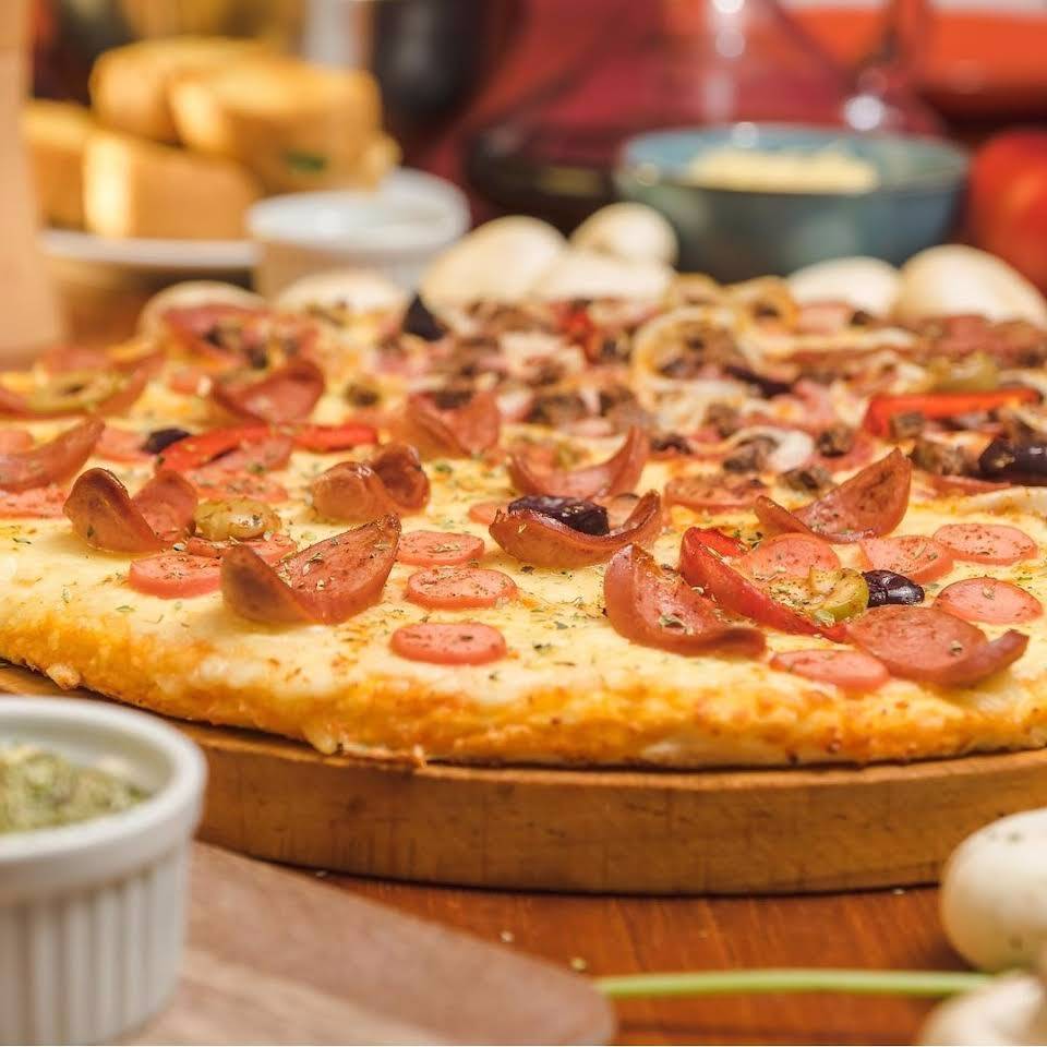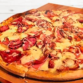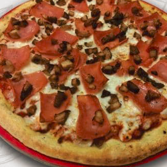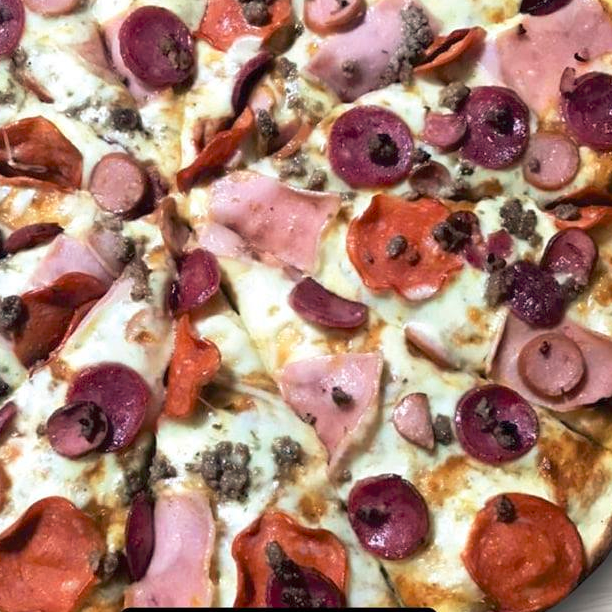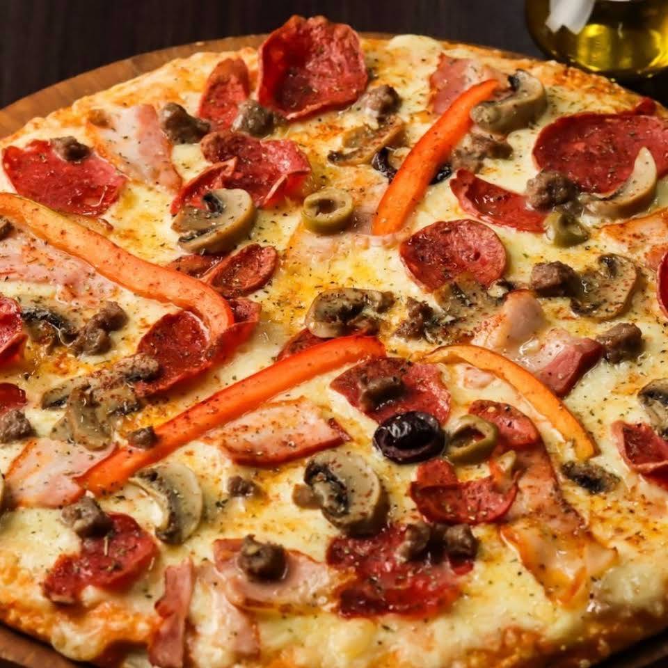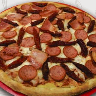 8 Porciones, incluye pomarola, mozzarella, carne pizzera, jamón, pepperoni, aceituna verde, hot dog, salame, pimiento, cebolla blanca, champiñones y chorizo.