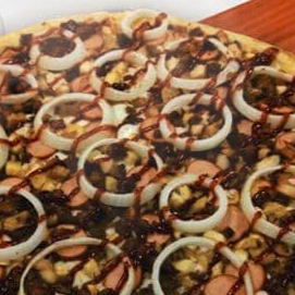 12 Porciones, incluye pomarola, mozzarella, asado de pollo, jamón, piña, cebolla blanca y salsa BBQ.