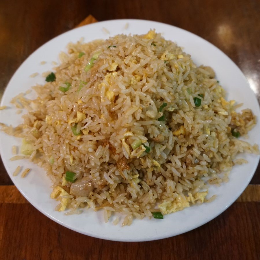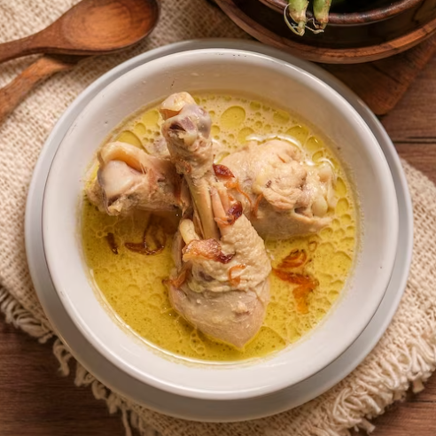 Sopa de gallina con fideos, presa de pollo mediana y huevo adicional.