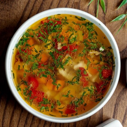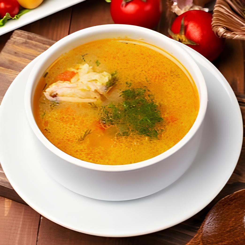 Sopa de gallina con fideos y presa de pollo mediana.