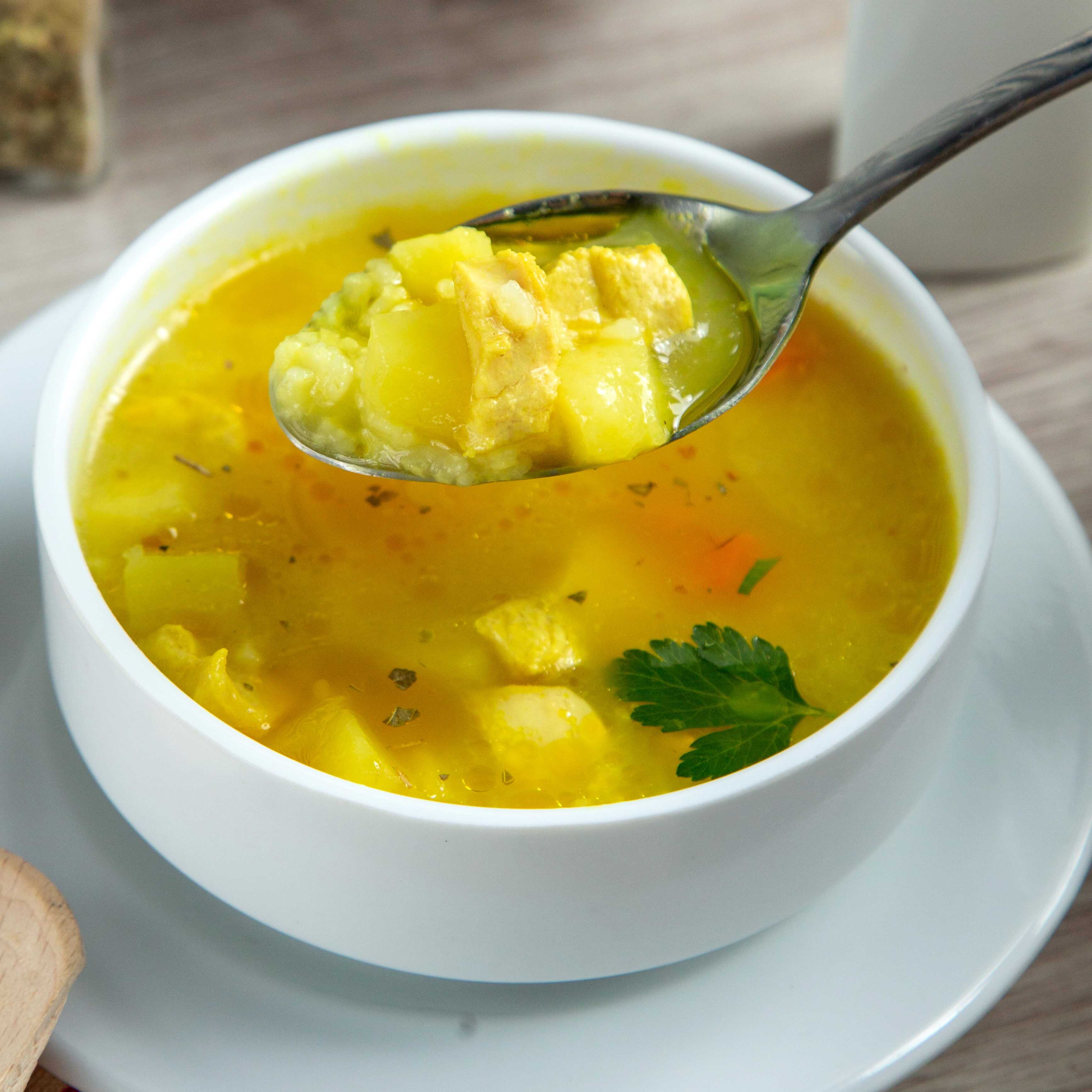 Sopa de gallina con fideos y presa de pollo pequeña.