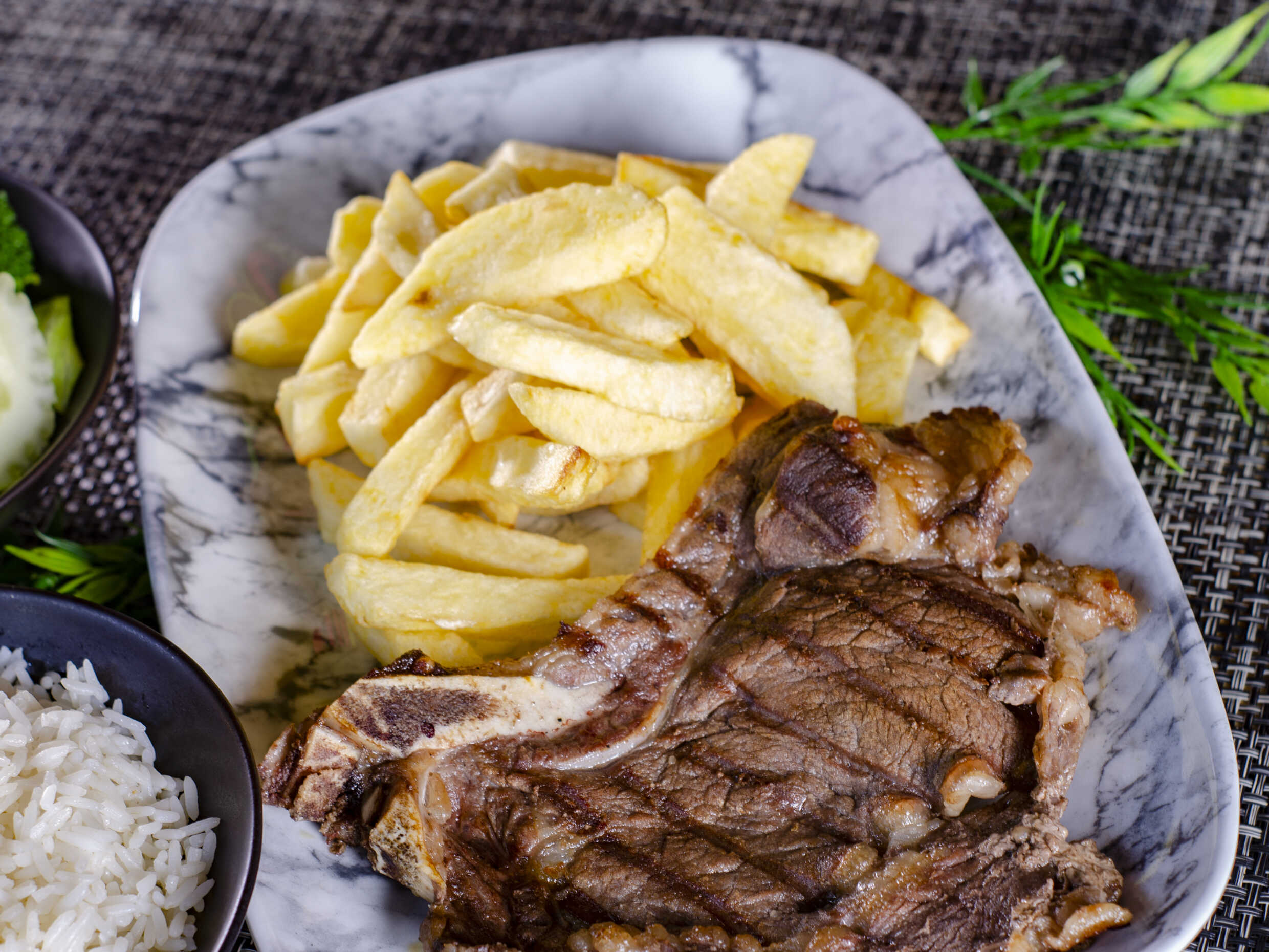 Bistec de res con papas fritas, ensalada fresca y arroz blanco.