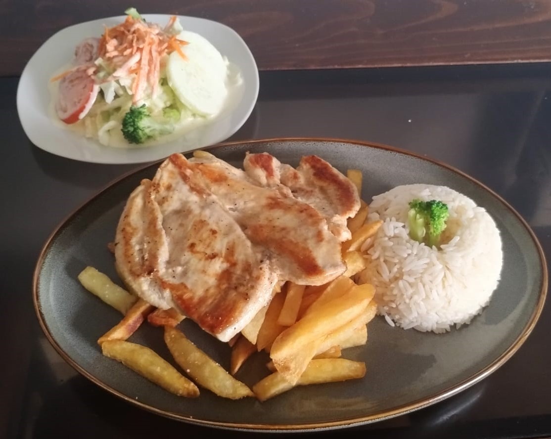 Delicioso filete de pollo a la plancha con papas fritas, ensalada fresca y arroz blanco.