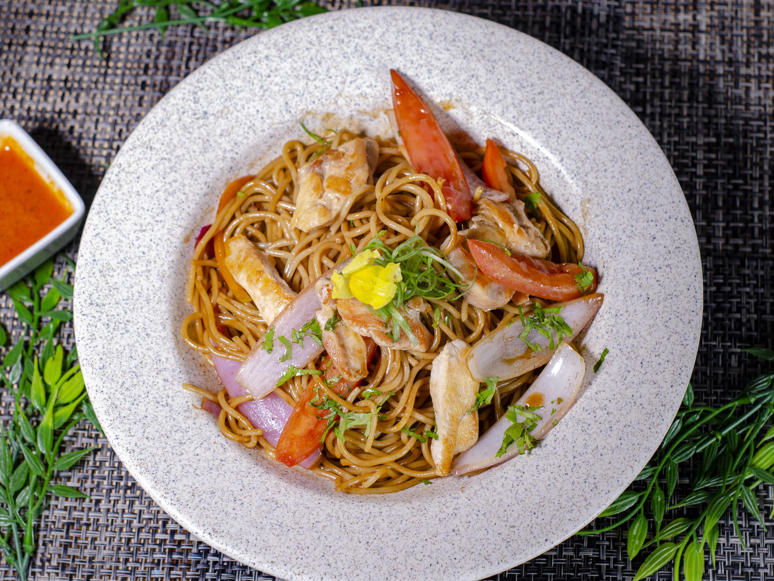 Tallarín saltado con pollo en trozos, cebolla china, tomate.