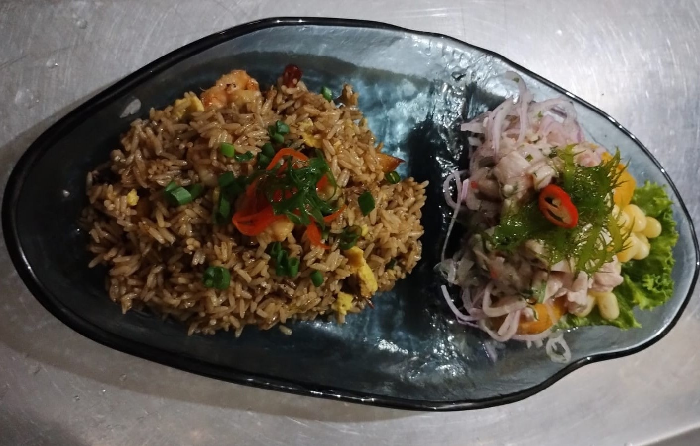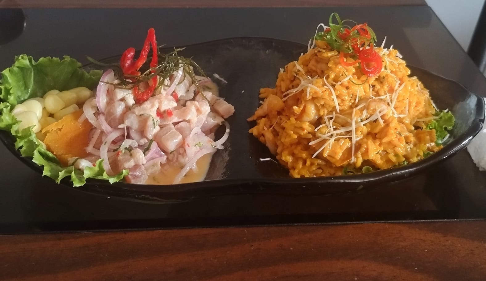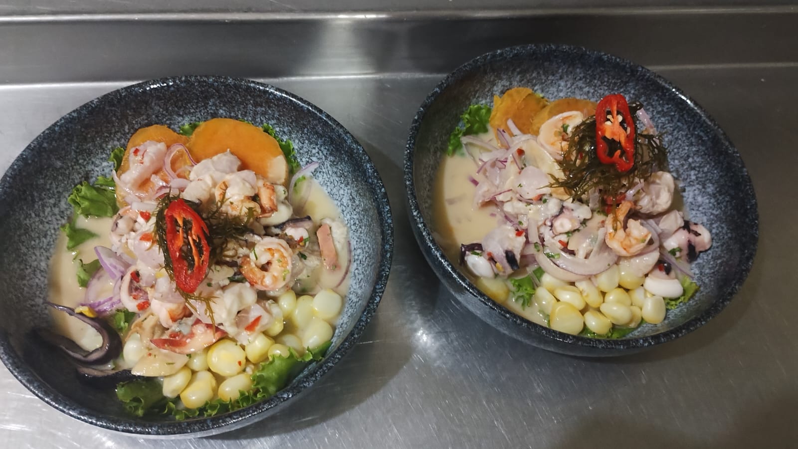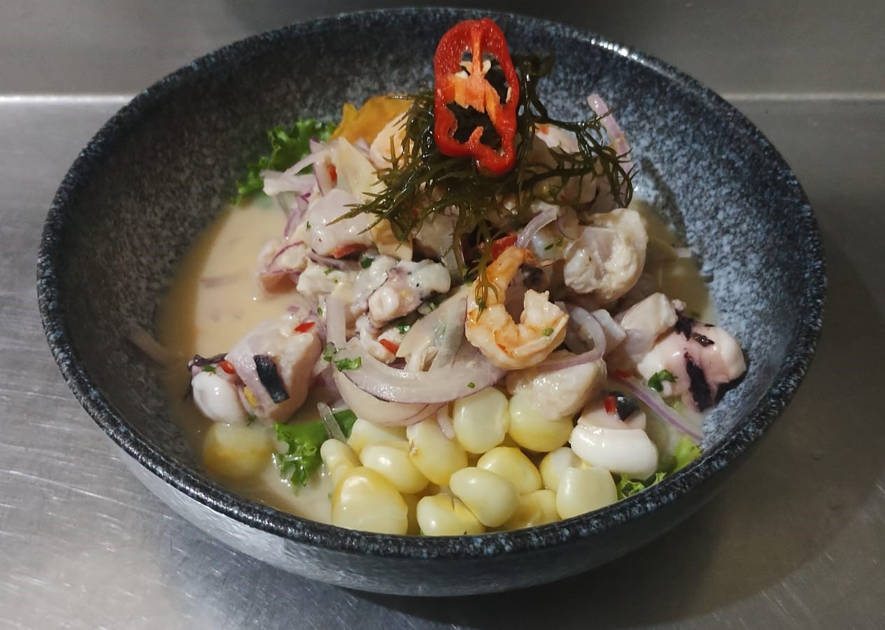 Ceviche de pescado con mixtura de mariscos frescos del día.