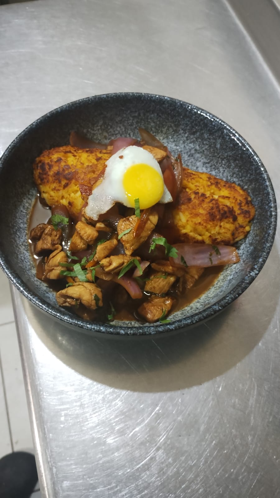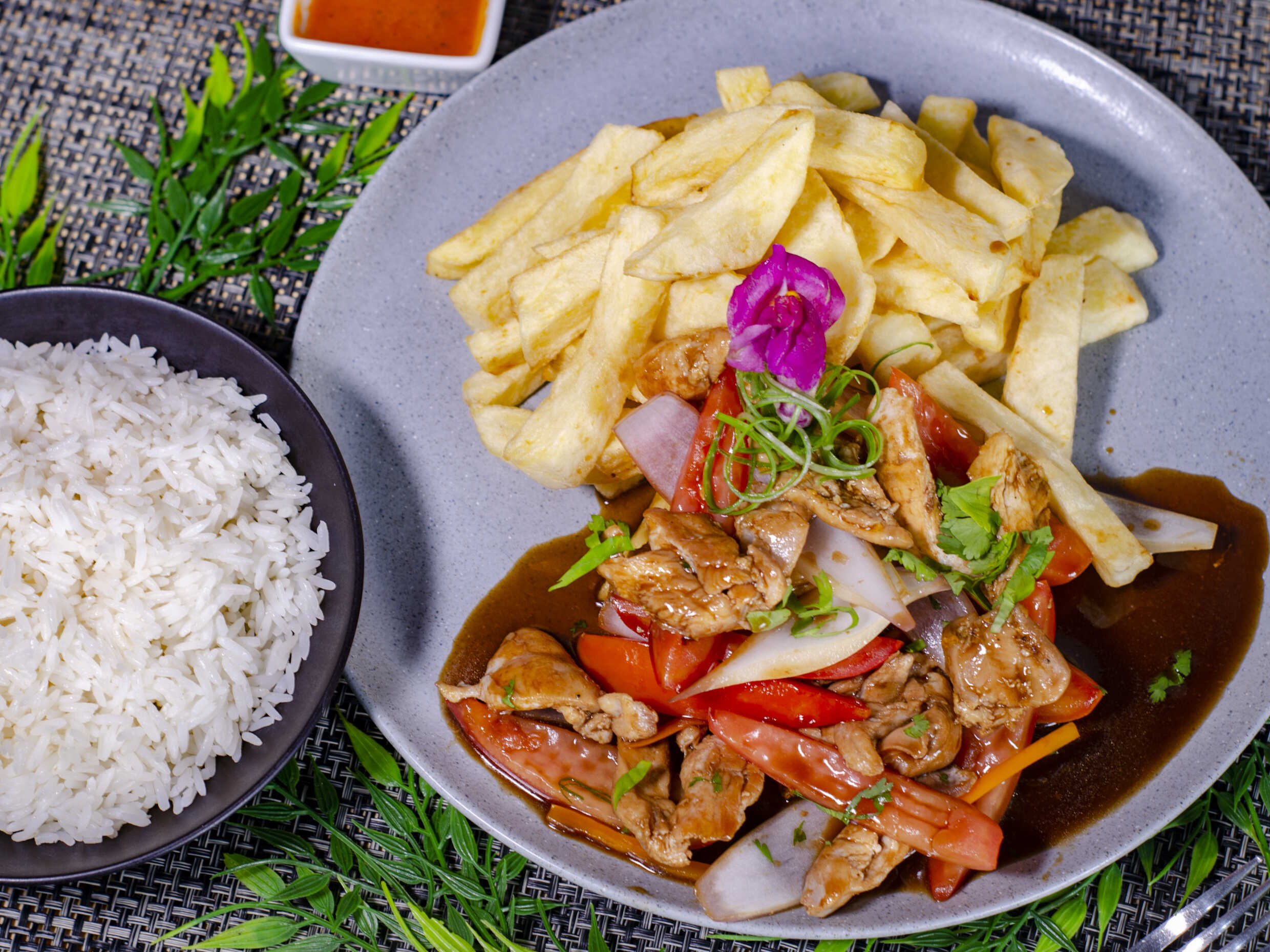 Lomo saltado de pollo con cebolla, tomate, papas fritas, arroz blanco.