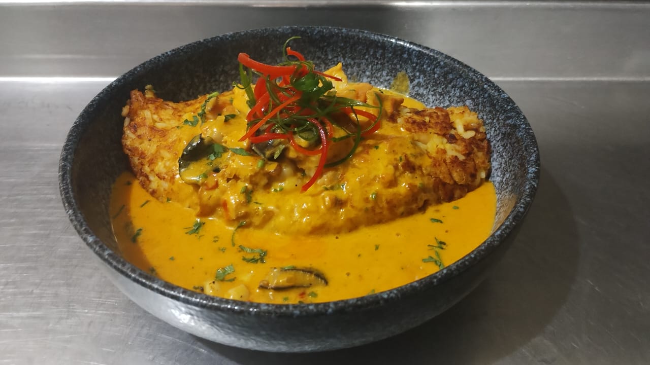 Mariscos flameados, salsa de la casa, envuelto en arroz meloso y arrisotado.