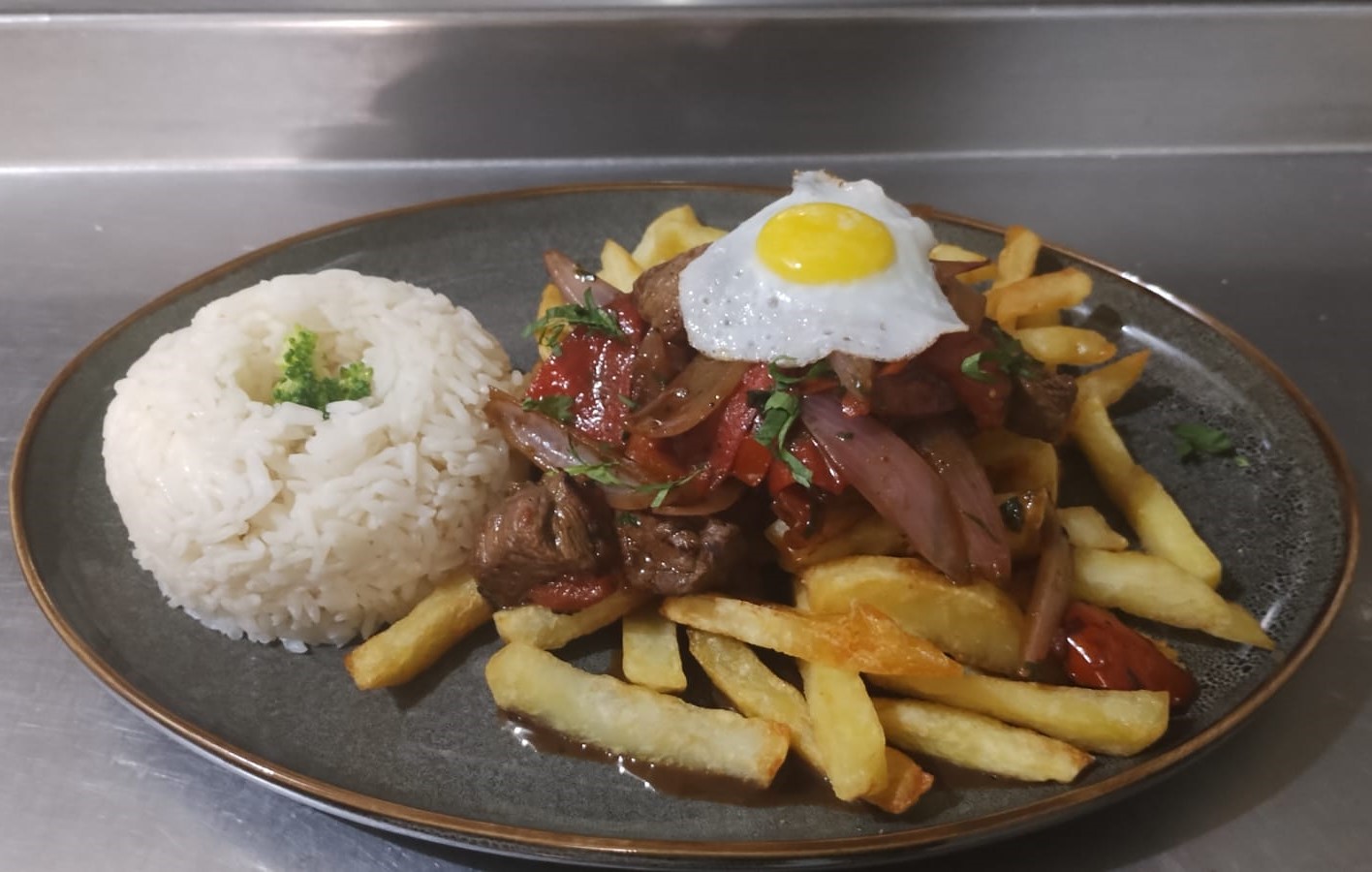 Lomo saltado con carne de res en trozos, cebolla, tomate, papas fritas acompañado con arroz blanco..
