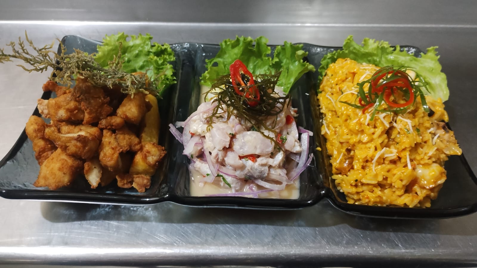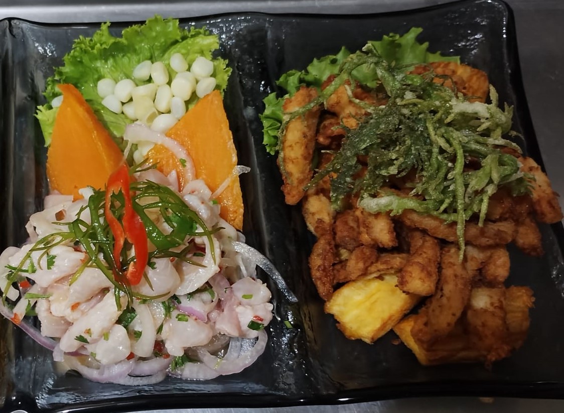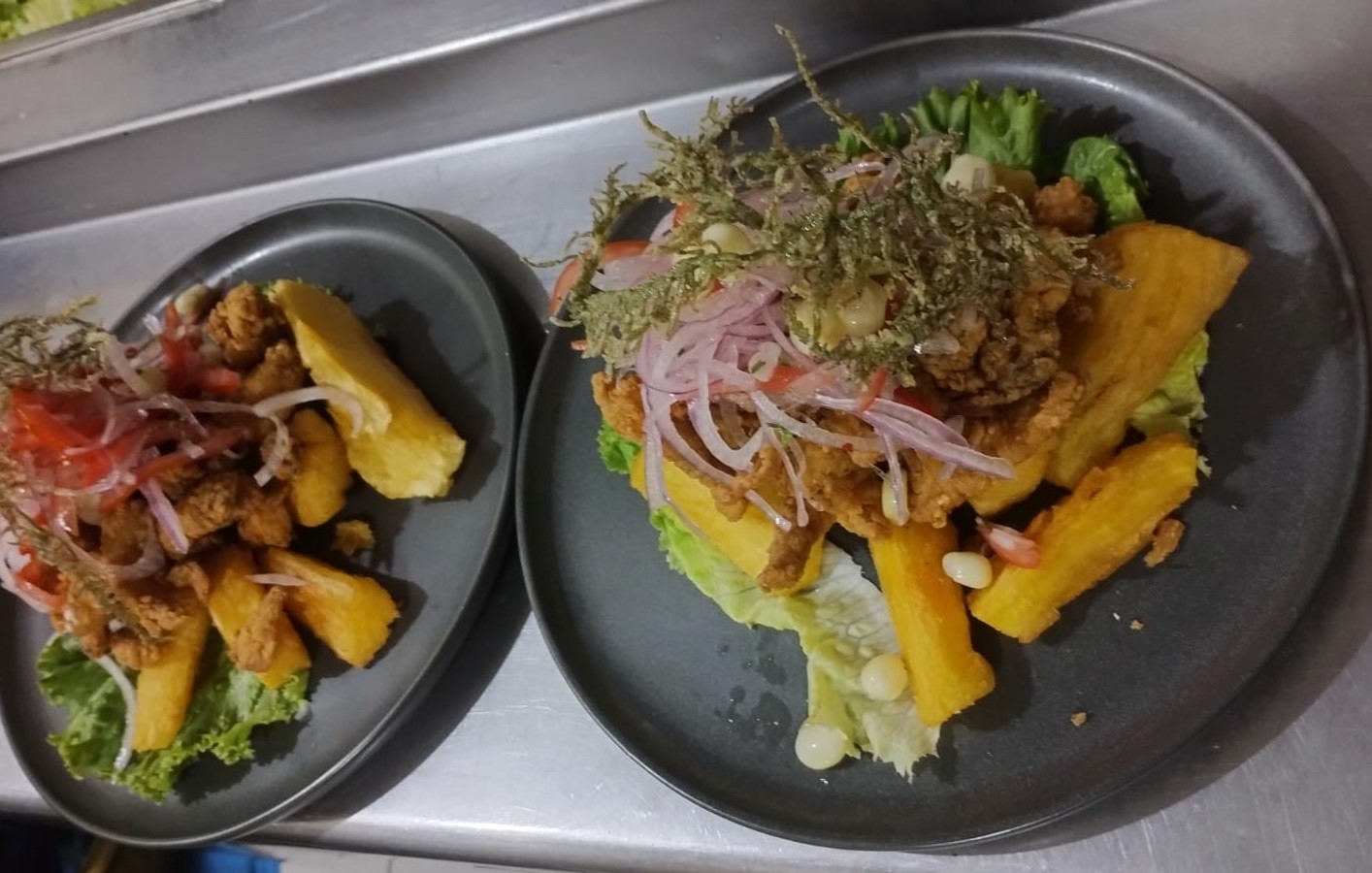Jalea de pescado del día en trozos marinados en harina, fritos al perol caliente, filete de pescado, yucas doradas, salsa criolla y tártara de la casa.