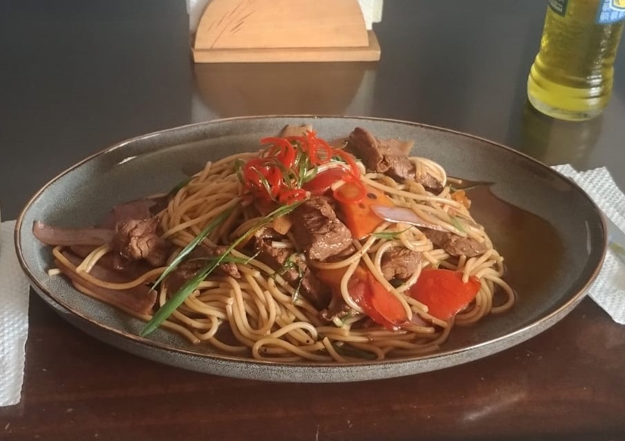 Tallarín saltado con trozos de carne, cebollas y tomates.
