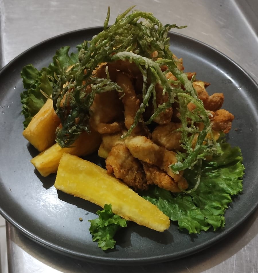Jalea de pescado del día en trozos marinados en harina, fritos al perol caliente, filete de pescado, mixtura de mariscos, yucas doradas, salsa criolla y tártara de la casa.