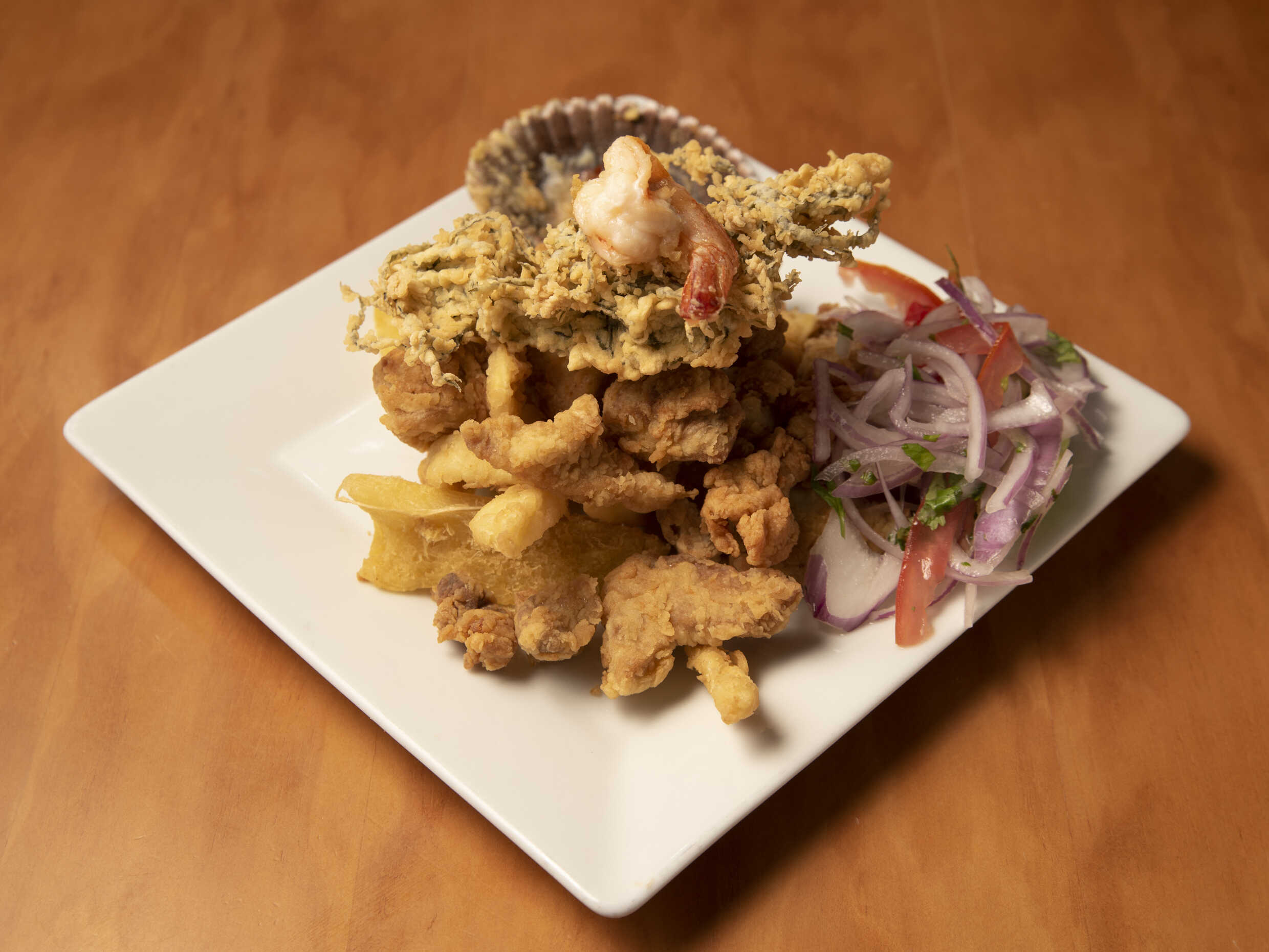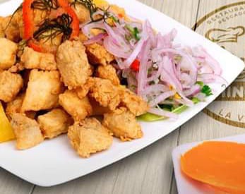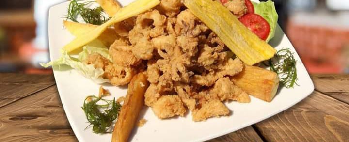 FRITURA CROCANTE DE POTA ACOMPAÑADO CON YUCAS FRITAS Y SALSA CRIOLLA.